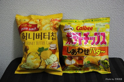 | 한국에서 '단짠' 열풍을 일으킨 주역이지만, 비슷한 콘셉트의 제품은 일본에도 존재합니다. 해태가루비는 한국의 해태제과와 일본의 가루비가 합작한 회사인데, 일본 가루비에는 '시아와세 버터(しあわせバター)', 즉 '행복 버터' 맛 감자칩이 있습니다. 꿀, 버터, 파슬리, 마스카포네 치즈의 네 가지 재료를 조합한 맛으로, 허니버터칩과 매우 유사한 콘셉트를 공유하고 있습니다. |